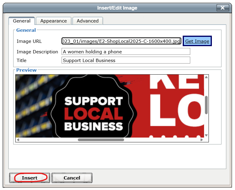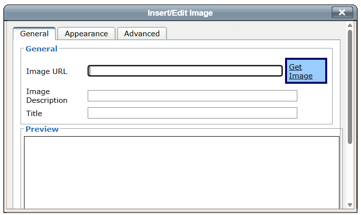 Click the "Get Image" link in the Insert/Edit Image window.