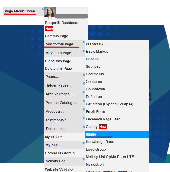 Selecting Page Menu: > Add to this Page > Image