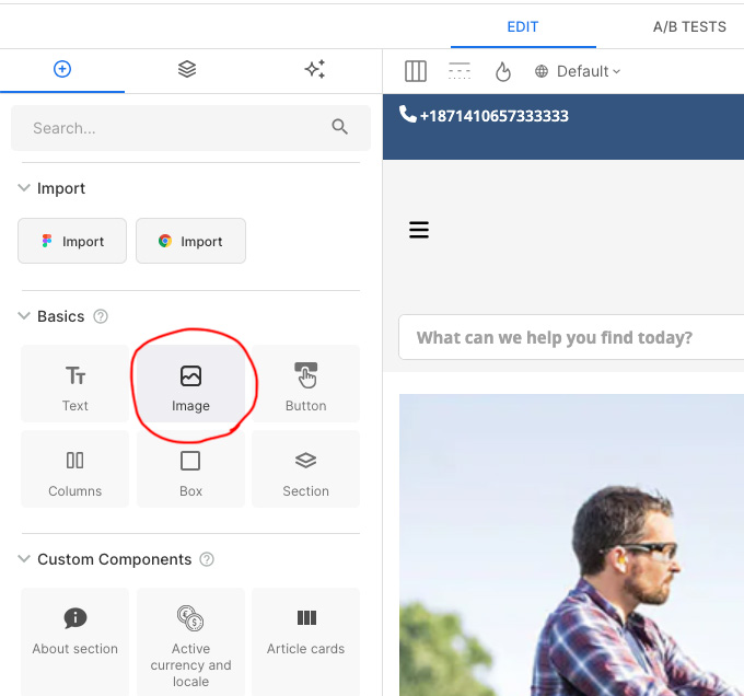 - Drag an Image block from the Basics insert tab and drop it onto the work area.