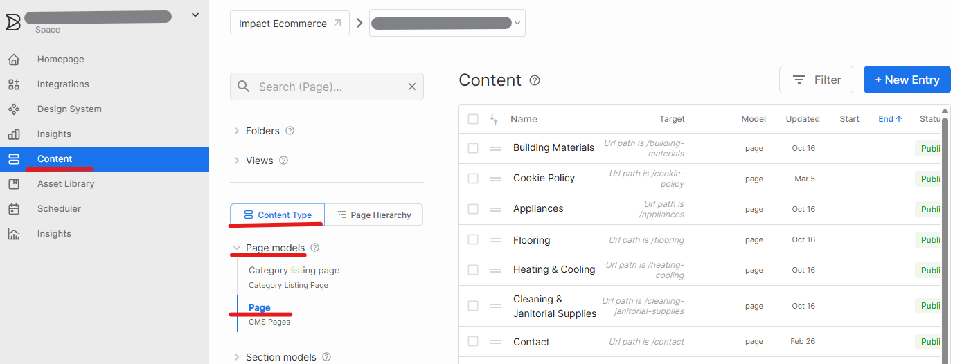 Content > Content Type > Page models > Page. You will see an area with a list of all your website pages on the right.